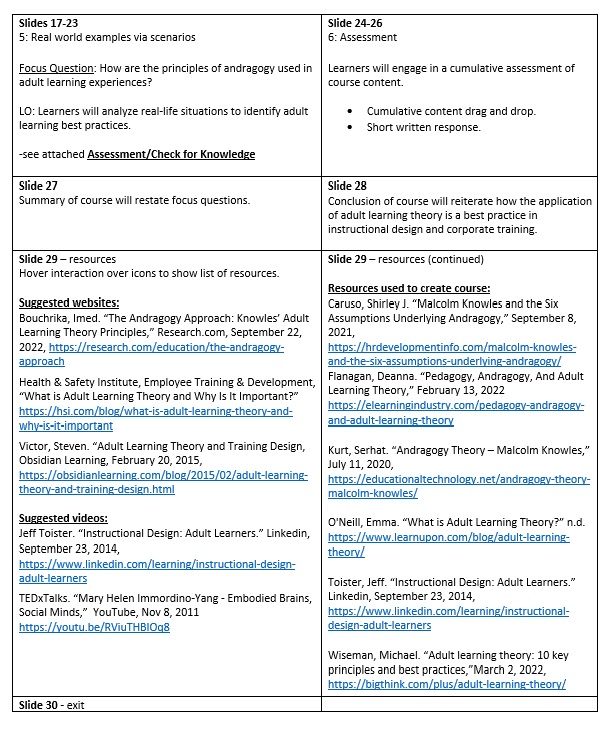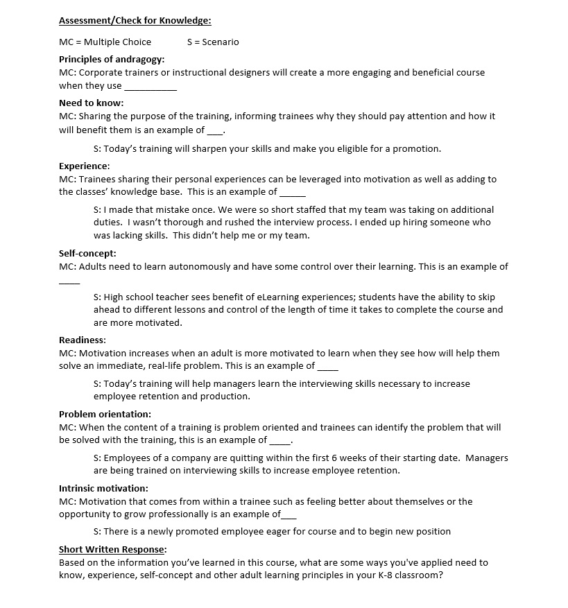 Solution: This course focuses on andragogy as a starting point for transitioning teachers to learn about adult learning theories and principles. By building on prior knowledge, the course introduces Knowles’ Principles of Andragogy (adult learning theory) in comparison to pedagogy (child learning theory). Learners experience the new information through a lens of experience and insight to optimize understanding. All multiple-choice selections display a description of an andragogy principle for repeated exposure to increase retention.